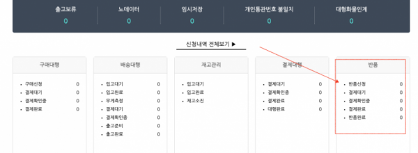 - 신청서가 빠른배송체크 혹은 요청에따라 무게측정이후 상태로 넘어간경우 ( 무게측정 상태 포함) 반품기능은 숨김처리가되니 플러스친구고객상담 혹은 1:1 게시판 신청서 댓글통하여 입고완료로 전환요청 넣어주셔야 됩니다.